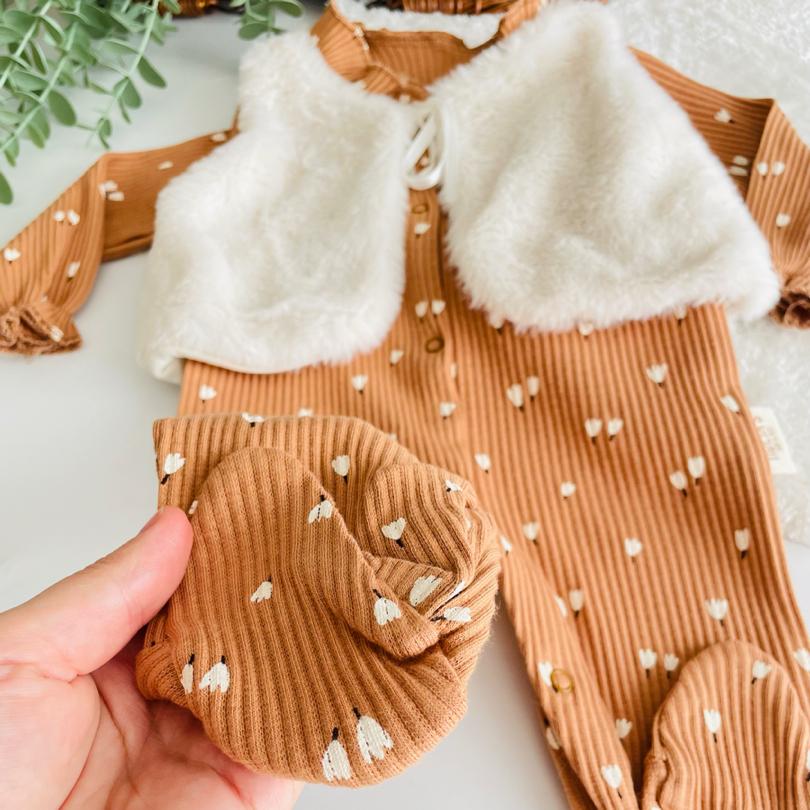 Tulumun yelek detayı, hem ekstra sıcaklık sağlar hem de kıyafete şık bir görünüm kazandırır. Yumuşak dikişleri sayesinde bebeğinizin cildine zarar vermeden gün boyunca rahatça hareket etmesine imkan tanır. Geniş yakası ve pratik düğme kapama sistemi ile giyip çıkarması son derece kolaydır.