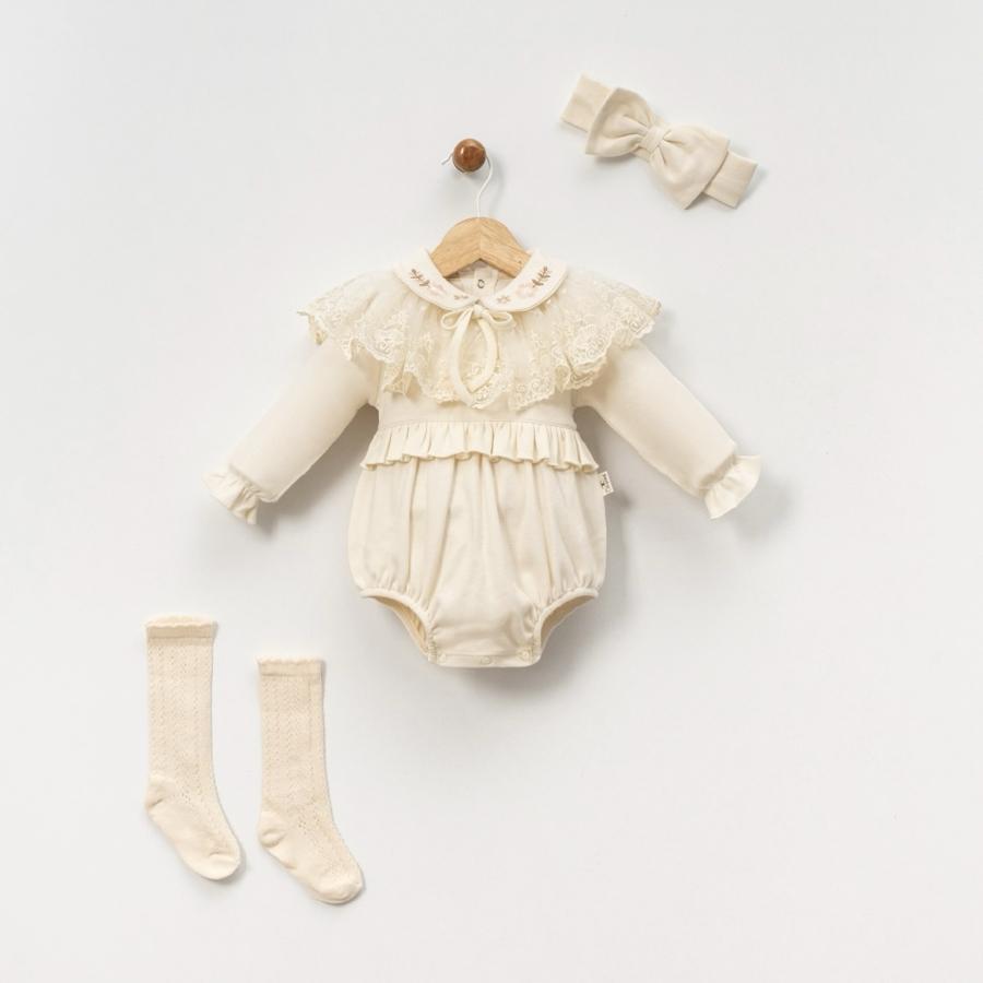 Setin tamamlayıcı parçası olan şirin saç bandı, romper ile uyumlu bir şekilde tasarlanmış ve kulakları sevimli bir şekilde sararak bebeğinize ekstra bir şıklık katıyor. Ayrıca, dantel detayı ile süslenmiş çoraplar, minik ayakları sıcak tutarken, aynı zamanda rompertaki zarif detaylarla harika bir uyum sağlıyor. Böylece, her açıdan göz alıcı bir görünüm elde ediliyor.