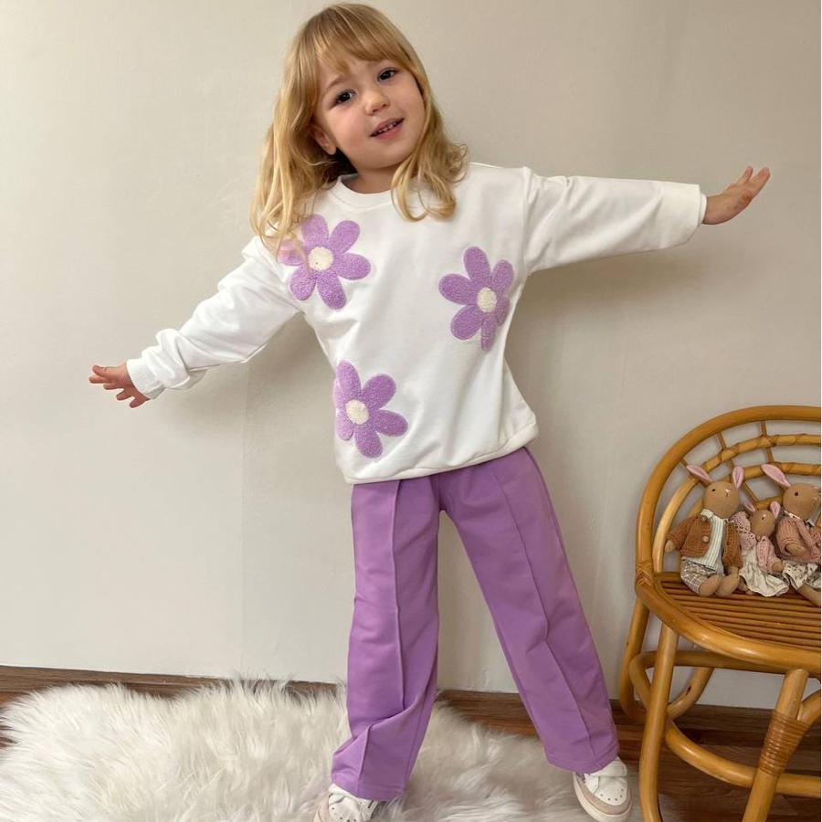 Papatya Nakışlı Geniş Paça Eşofman Kız Çocuk İkli Takım