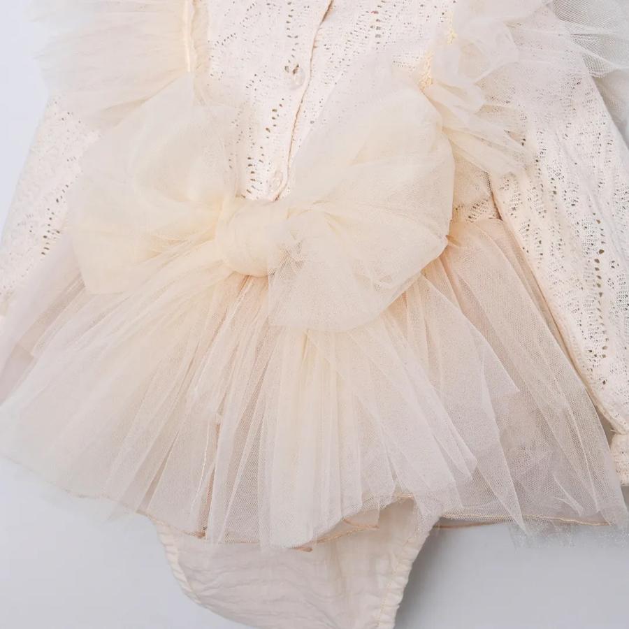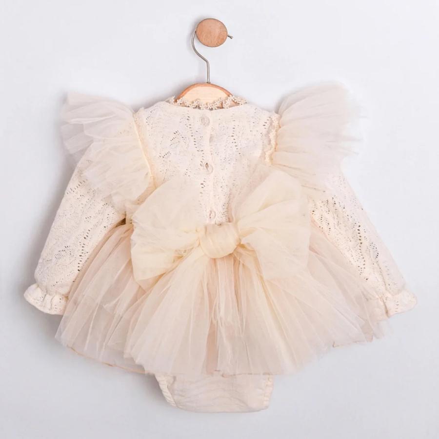 • Dantelli Üst Kısım: Elbisenin üst kısmında kullanılan kaliteli dantel, hem şıklık sağlar hem de bebeğinizin cildine nazik bir dokunuş sunar.